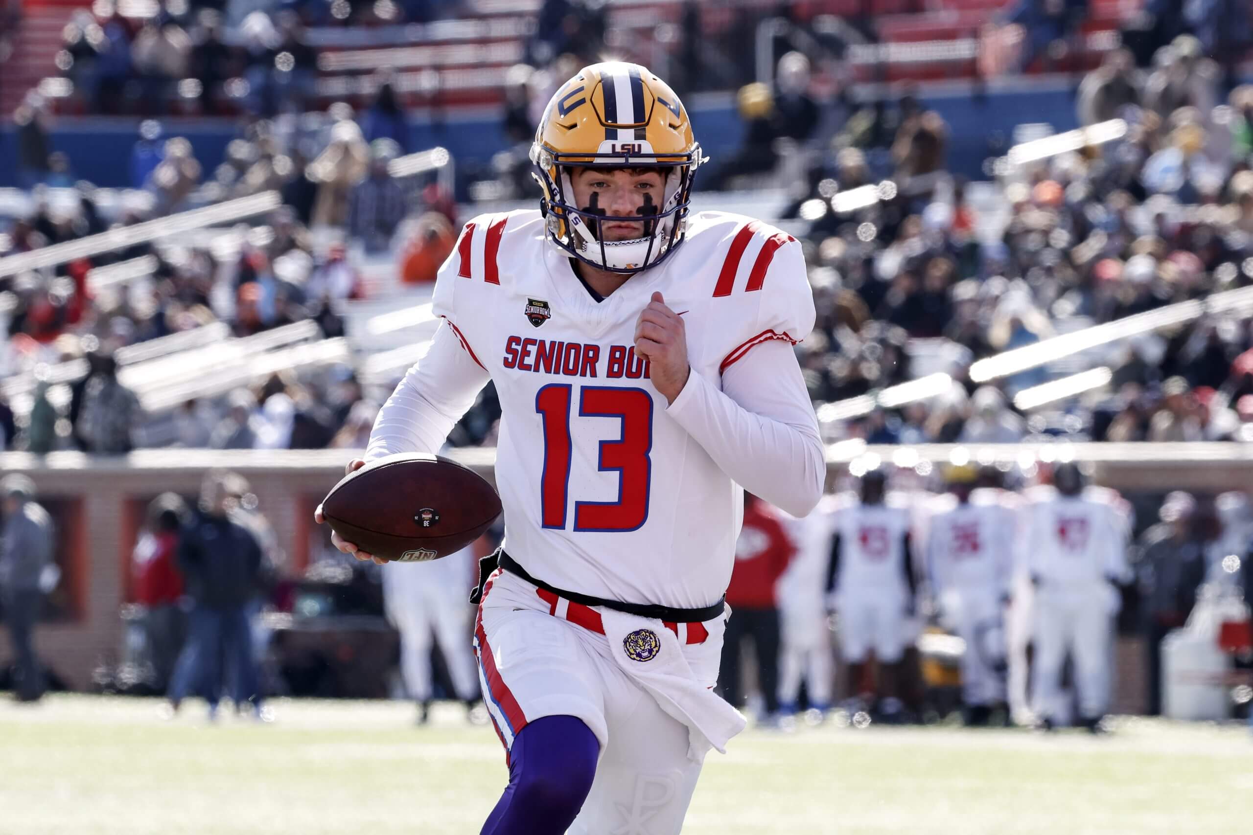Garrett Nussmeier participated in this year’s Senior Bowl in an effort to boost his stock before the NFL Draft. (Don Juan Moore / Getty Images)