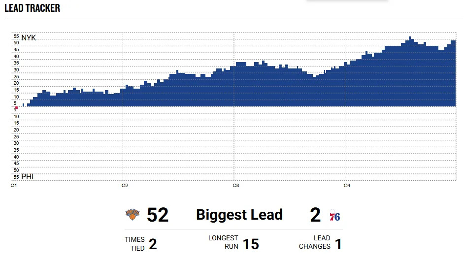 Tyrese Maxey (32 PTS, 9-21 FG) tried to keep Philadelphia afloat, but his was mostly a solo performance. By halftime, New York was steamrolling the Cheesesteaks, 72-42.