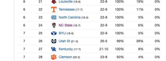 Team Rankings believes NC State is a lock for the tournament, listing them as 100% odds on making it, but also projecting them to finish with a 22-9 record. To get to that, NC State would win 4 of their next 6 game. Their upcoming schedule is Miami, UNC, Duke, Virginia, and Stanford. Yeah, if NC State wins 4 of those, no duh, they’d be 100% in. But winning 4 of those 6 doesn’t seem so easy.