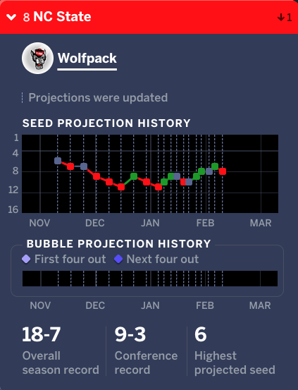 ESPN Bracketology has NC State in as an 8th seed, which is one spot down from last week. They believe NC State’s ceiling is a 6th seed.