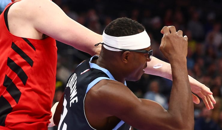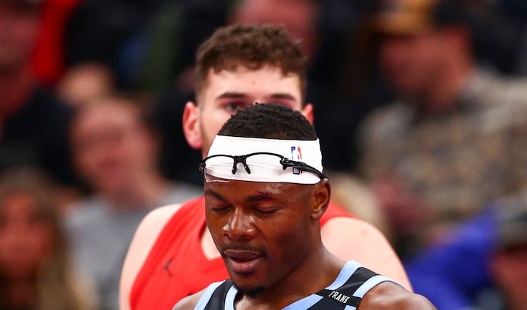 A cut is seen on the eyebrow of Utah Jazz center Oscar Tshiebwe (34) after a lens got knocked out of his glasses during the first half of an NBA game against the Portland Trail Blazers at the Delta Center in Salt Lake City on Thursday, Feb. 12, 2026. | Rio Giancarlo, Deseret News