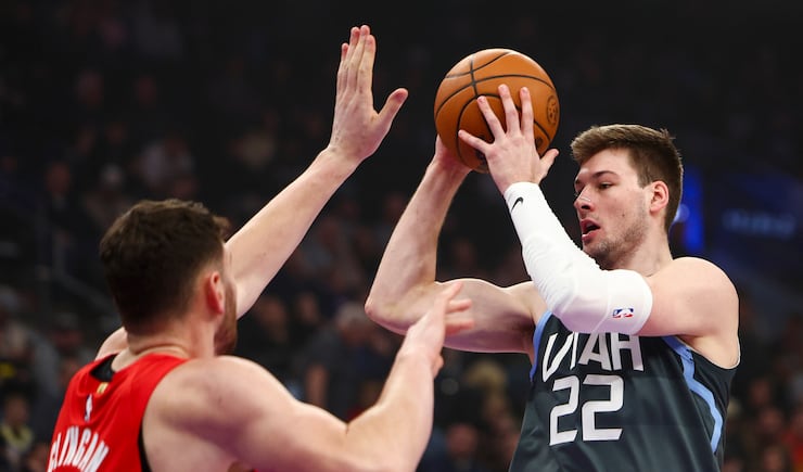Utah Jazz guard John Konchar (55) makes a pass during the first half of an NBA game against the Portland Trail Blazers at the Delta Center in Salt Lake City on Thursday, Feb. 12, 2026. | Rio Giancarlo, Deseret News