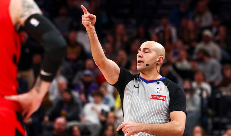 Referee Mousa Dagher ejects Utah Jazz guard Vince Williams Jr. (0), not pictured, after Williams Jr. threw the ball at him during the first half of an NBA game against the Portland Trail Blazers at the Delta Center in Salt Lake City on Thursday, Feb. 12, 2026. | Rio Giancarlo, Deseret News