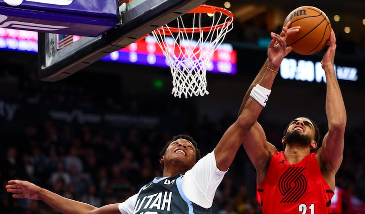 Portland Trail Blazers center Donovan Clingan (23) grabs a rebound over Utah Jazz center Oscar Tshiebwe (34) during the first half of an NBA game at the Delta Center in Salt Lake City on Thursday, Feb. 12, 2026. | Rio Giancarlo, Deseret News