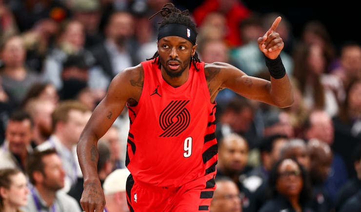 Portland Trail Blazers forward Jerami Grant (9) celebrates after making a 3-pointer against the Utah Jazz during the first half of an NBA game at the Delta Center in Salt Lake City on Thursday, Feb. 12, 2026. | Rio Giancarlo, Deseret News