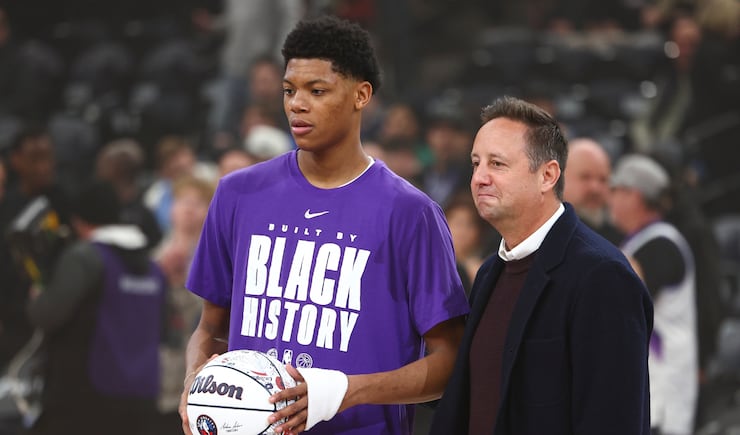 Utah Jazz guard Ace Bailey (19) poses next to Austin Ainge, president of basketball operations for the Utah Jazz, as he is recognized after being named to the NBA Rising Stars team before an NBA game against the Portland Trail Blazers at the Delta Center in Salt Lake City on Thursday, Feb. 12, 2026. | Rio Giancarlo, Deseret News