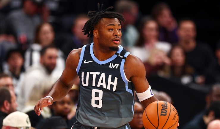 Utah Jazz guard Isaiah Collier (8) moves the ball up the court during the first half of an NBA game against the Portland Trail Blazers at the Delta Center in Salt Lake City on Thursday, Feb. 12, 2026. | Rio Giancarlo, Deseret News