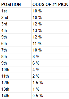 Currently the worst three teams in the league have 14% chances at the first-overall pick. That drops to 12.5%, 10.0%, and so on.