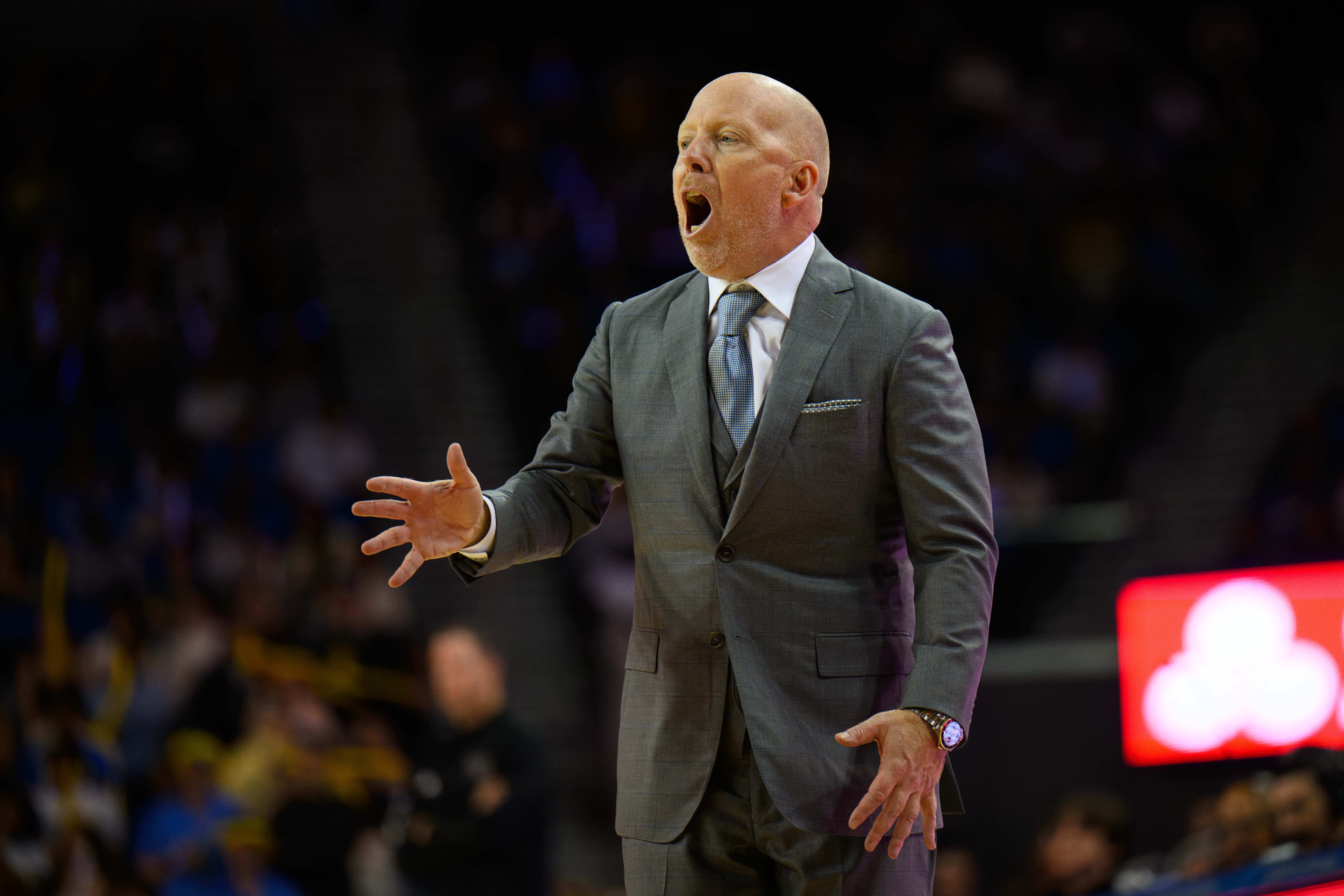 UCLA men’s basketball coach Mick Cronin yells from the sideline. (Andrew Ramiro Diaz/Photo editor)