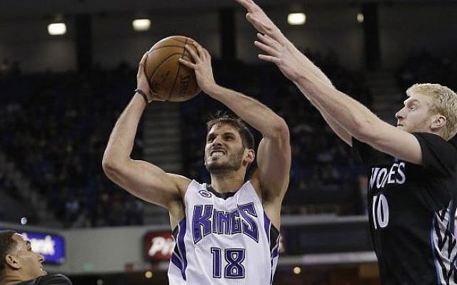Sacramento Kings forward Omri Casspi drives to the basket between Minnesota Timberwolves players during the second half of an NBA game in Sacramento, California, on April 7, 2015. (Rich Pedroncelli/AP)
