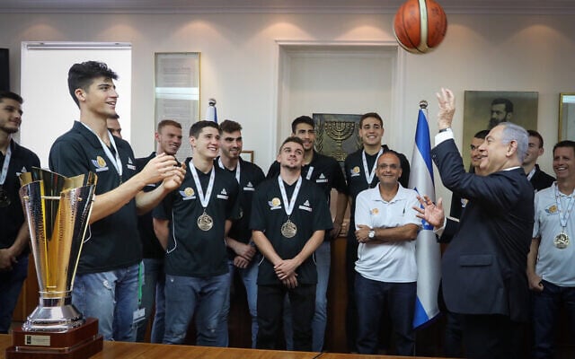 Prime Minister Benjamin Netanyahu and Deni Avdija after the Israel youth basketball team’s victory at the FIBA European Championships, at the Prime Minister’s Office on July 24, 2019 (Marc Israel Sellem/POOL)