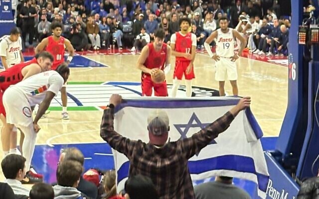 Fan Lavi Kirel waves an Israeli flag as basketball player Deni Avdija takes a free throw during a March 3 game in Philadelphia. (Jon Marks/Times of Israel)