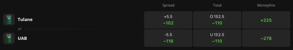 Looking at the odds for this matchup, UAB enters as a 5.5-point favorite with -278 moneyline odds on DraftKings Sportsbook. Tulane holds +225 odds of winning outright, and the game total is set at 152.5 points.