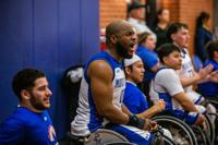 Freshman Shawn Simmions cheers for the team during a game against the Dallas Wheelchair Mavericks on Feb. 14 at the Physical Education Building. The team won against Bayou City and the Wounded Warriors Abilities Ranch Generals later in the day.