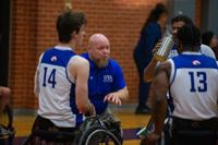 Aaron Gouge, Movin’ Mavs head coach, talks to the team during a game against the Dallas Wheelchair Mavericks on Feb. 14 at the Physical Education Building. The women’s and men’s wheelchair basketball teams will move to the College Park Center as part of their shift to UTA’s Athletics department.