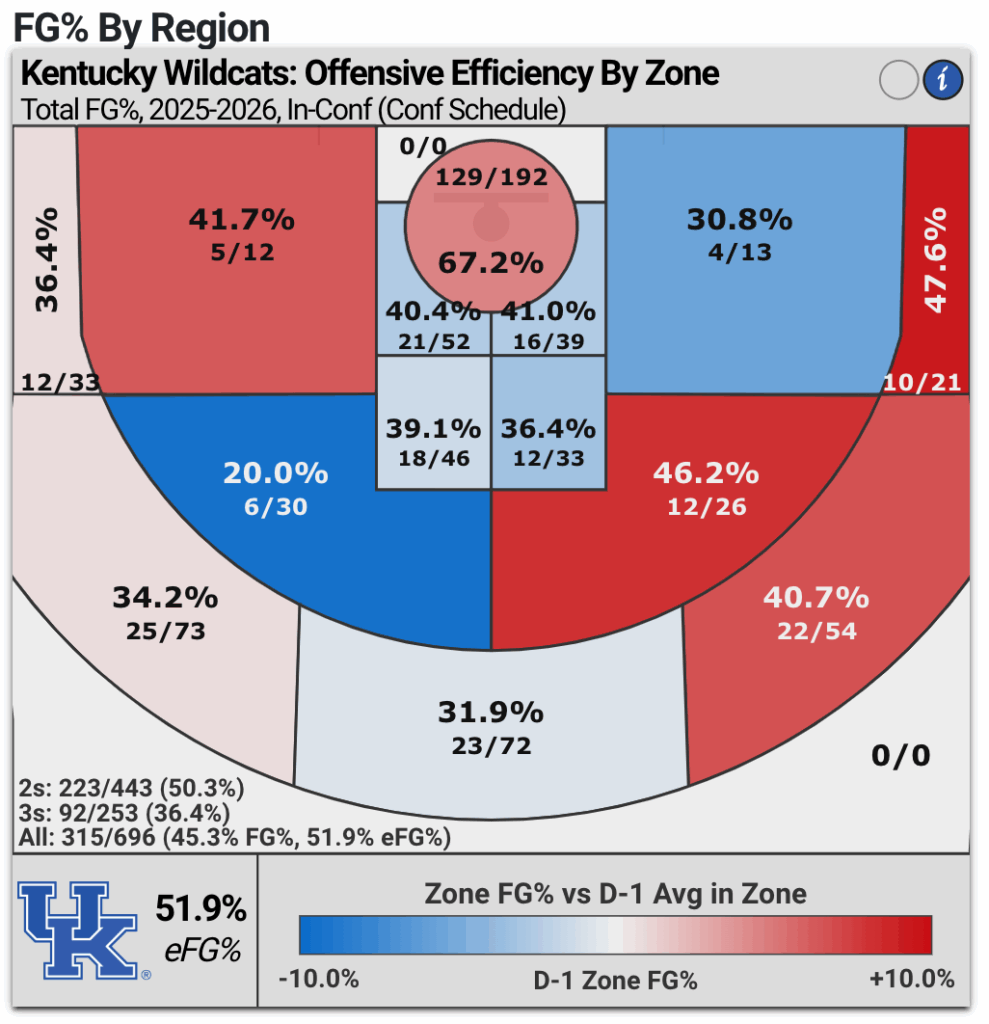 To be fair, Florida forces more missed layups than anyone in the country. Their size and length underneath make finishing tough for anyone, but Kentucky has struggled at the rim throughout conference play. Let’s look at the numbers.