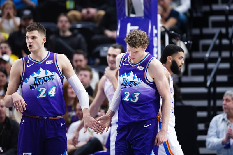 Utah Jazz forward Lauri Markkanen (23) is congratulated by Utah Jazz center Walker Kessler (24) during a game at Vivint Arena in Salt Lake City on Feb. 23, 2023. | Ryan Sun, Deseret News