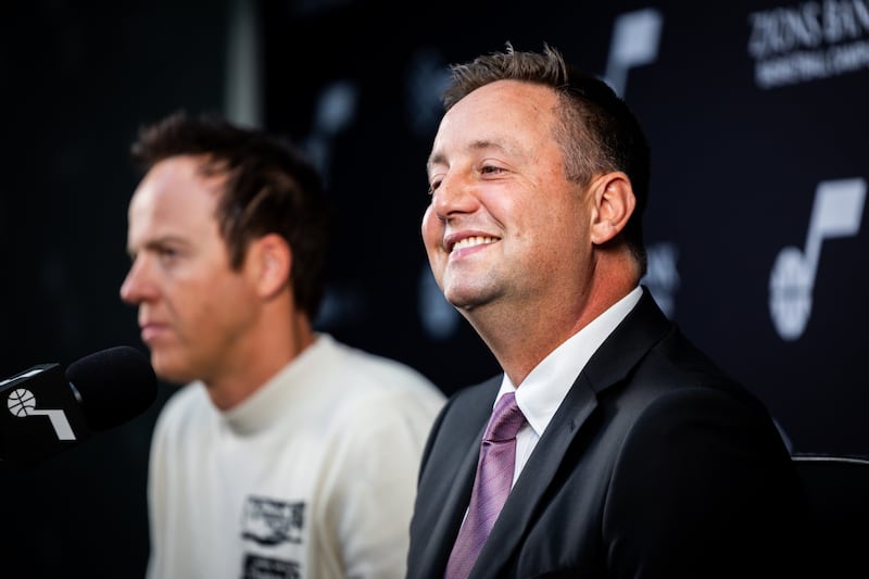 Austin Ainge, president of basketball operations for the Utah Jazz, speaks during an introductory media availability with Utah Jazz Governor Ryan Smith, left, at Zions Bank Basketball Campus in Salt Lake City on Monday, June 2, 2025. | Tess Crowley, Deseret News