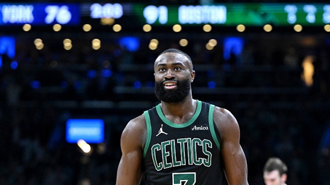 BOSTON, MASSACHUSETTS – MAY 14: Jaylen Brown #7 of the Boston Celtics reacts against the New York Knicks during the third quarter in Game Five of the Eastern Conference Second Round NBA Playoffs at TD Garden on May 14, 2025 in Boston, Massachusetts. (Photo by Brian Fluharty/Getty Images)