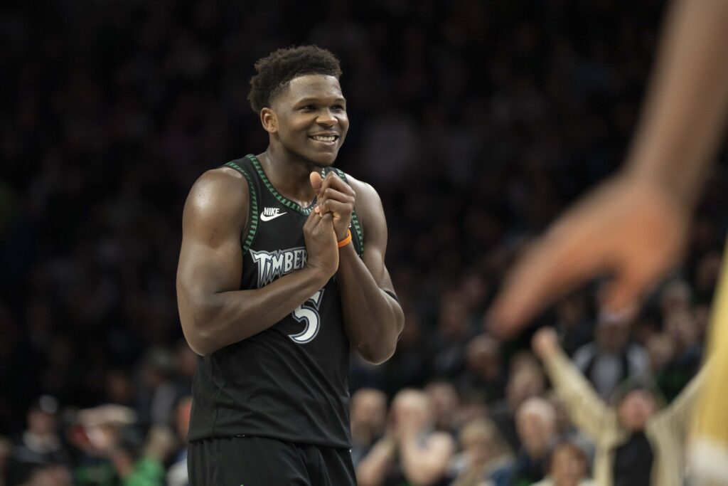 Feb 6, 2026; Minneapolis, Minnesota, USA; Minnesota Timberwolves guard Anthony Edwards (5) smiles against the New Orleans Pelicans in the second half at Target Center. Mandatory Credit: Jesse Johnson-Imagn Images