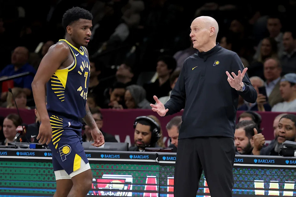 Feb 11, 2026; Brooklyn, New York, USA; Indiana Pacers head coach Rick Carlisle talks to guard Kam Jones (7) during the first quarter against the Brooklyn Nets at Barclays Center. Mandatory Credit: Brad Penner-Imagn Images