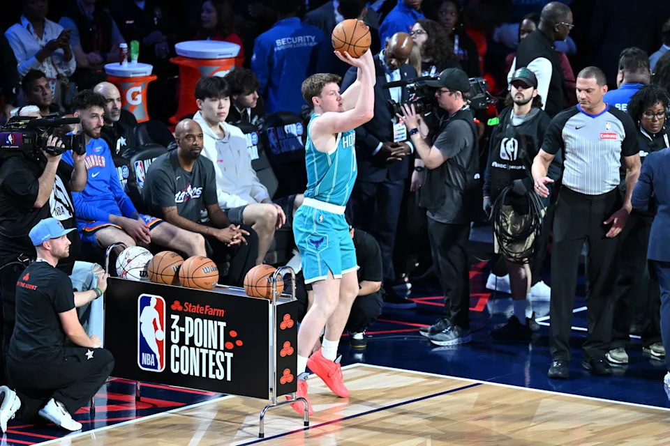 Charlotte Hornets forward Kon Knueppel (7) competes in the 3-point contest.
