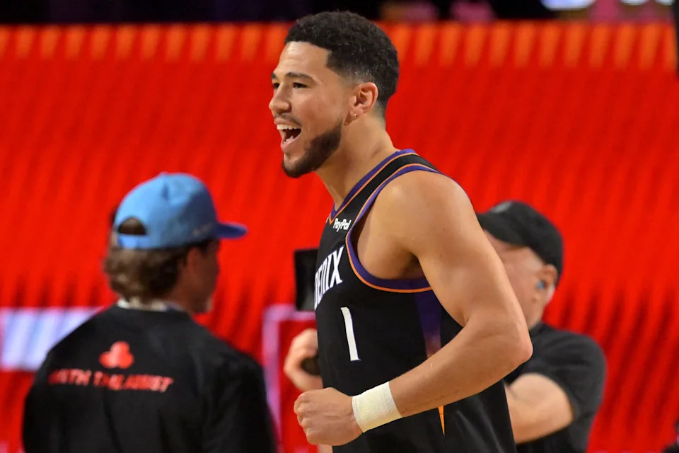 Phoenix Suns guard Devin Booker (1) reacts during the 3-point contest.