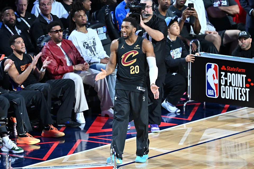 Cleveland Cavaliers guard Donovan Mitchell (20) reacts during the 3-point contest.