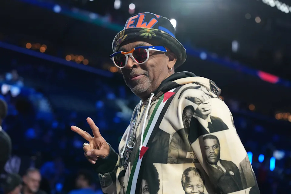 Spike Lee acknowledges a fan before the start of NBA All-Star Saturday Night.