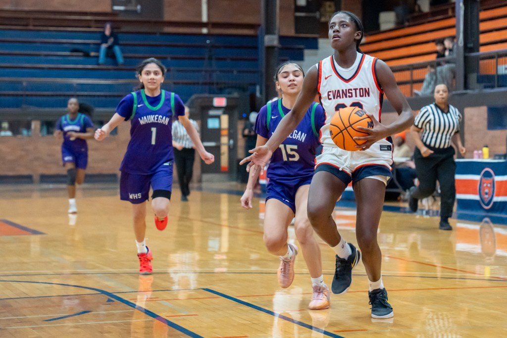 Sophomore Charity Bryant, seen here playing against Waukegan in early February, scored 25 points as ETHS romped over Maine West in the opening round of the Glenbrook South Regional tournament on Tuesday. Credit: Richard Cahan