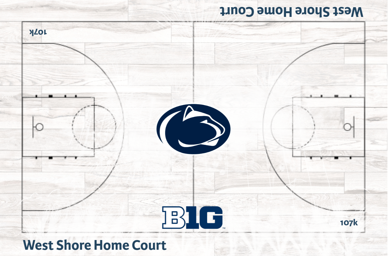 The classic Penn State White Out. Inspired by the energy of the Beaver Stadium game, the court would create an electric and unforgettable atmosphere. The bright white hardwood would immediately stand out, symbolizing the unity and intensity that define a White Out night. Incorporating subtle white fireworks graphics bursting across the court would add movement and celebration to the design. The 107k in the corners represent the proud 107k fans that pack out the White Out game every year.