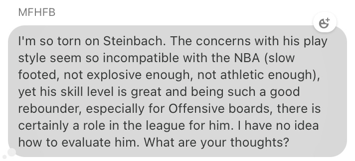 I’m high on Steinbach with his elite skill of offensive rebounding. He also has this intersection of skill and physicality — screening, passing, defensive angles, and a soft touch. I have concerns with his defensive viability because he’s not entirely a perimeter defender or rim protector. In addition, he’s not an outside shooter. Nonetheless, he’s been incredibly productive dating back to pre-NCAA. He has a valuable elite skill in the possessions game, a key in this NBA. If he slips past the lottery, he’ll outplay his draft position — although he should be more complementary than centerpiece, the best comparison would be an outcome of Steven Adams vs. an Alperen Sengun one.