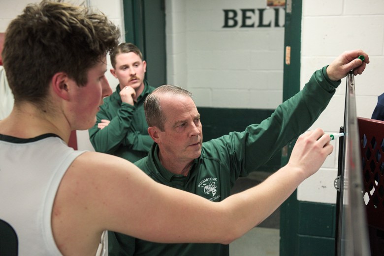 Aksel Oates, left, steps up to offer his thoughts to coaches Scott Brooks, right, and Connor Brooks, background, in the Woodstock Union locker room at halftime of their game with Bellows Falls in Woodstock, Vt., on Monday, Feb. 16, 2026. Woodstock won 66-33. JAMES M. PATTERSON / Valley News