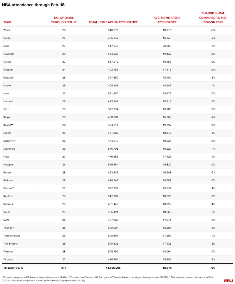The NBA drew 14.8 million fans prior to this year’s All‑Star break, according to an analysis of official league data by SBJ’s David Broughton, including 106,372 fans across six neutral‑site games. The league’s average attendance through 814 games played prior to the All-Star break was 18,078, flat compared to games played through last year’s break.
