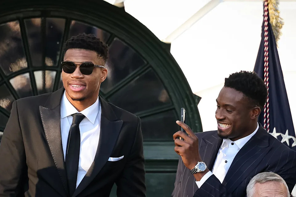 Giannis Antetokounmpo (left) and Thanasis Antetokounmpo (right) interact as President Joe Biden welcomes the Milwaukee Bucks to the South Lawn of the White House on Nov. 8, 2021 to honor the team for its NBA championship earlier that summer.