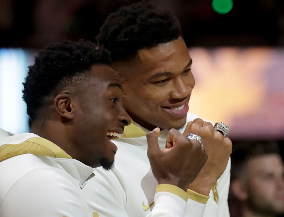 Milwaukee Bucks forward Giannis Antetokounmpo (34) Thanasis Antetokounmpo (43) show off their championship rings during Milwaukee Bucks ring ceremony before the season opener against the Brooklyn Nets at Fiserv Forum in Milwaukee on Tuesday, Oct. 19, 2021.