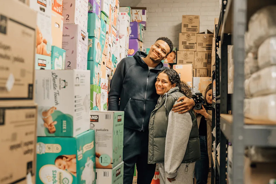 Bucks superstar Giannis Antetokounmpo and his longtime partner Mariah Riddlesprigger at the Milwaukee Diaper Mission on Sept. 11, 2023.
