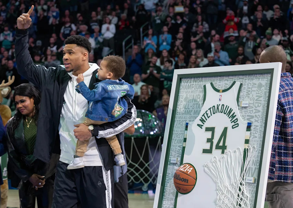 Milwaukee Bucks forward Giannis Antetokounmpo holds his son, Maverick Shai, while being honored for his career accomplishments before their game against the Memphis Grizzlies on Friday, April 7, 2023, at Fiserv Forum in Milwaukee, Wisconsin.