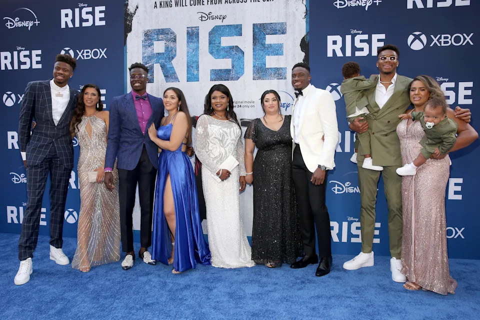 Kostas Antetokounmpo, Alex Antetokounmpo, Veronica “Vera” Antetokounmpo, Thanasis Antetokounmpo and Giannis Antetokounmpo with family attend the world premiere of Rise at Walt Disney Studios in Burbank, California, on June 22, 2022.
