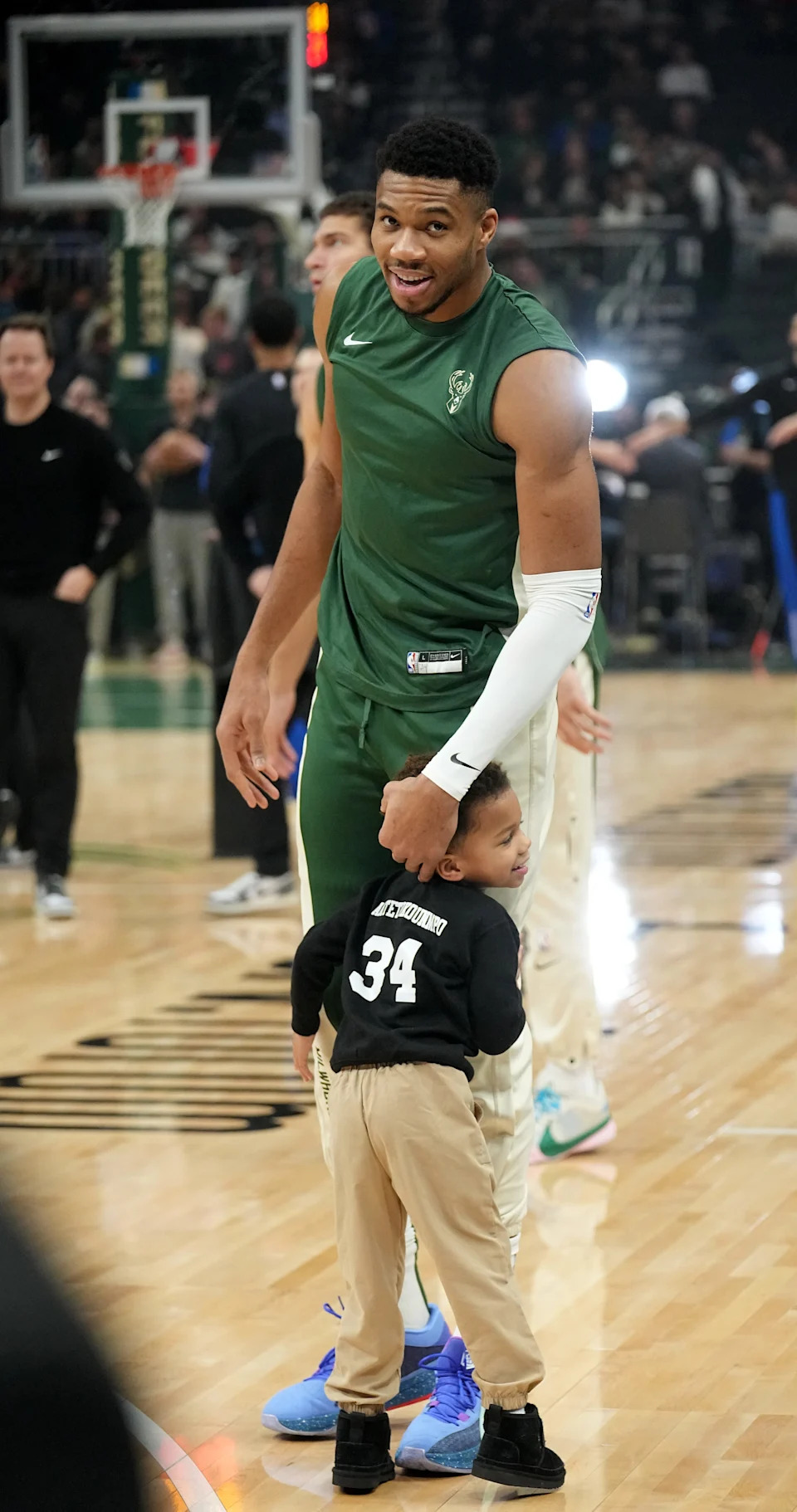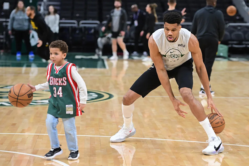Feb 6, 2026; Milwaukee, Wisconsin, USA; Milwaukee Bucks forward Giannis Antetokounmpo (34) warms up with his son Maverick, age 4, before game against the Indiana Pacers at Fiserv Forum. Mandatory Credit: Benny Sieu-Imagn Images