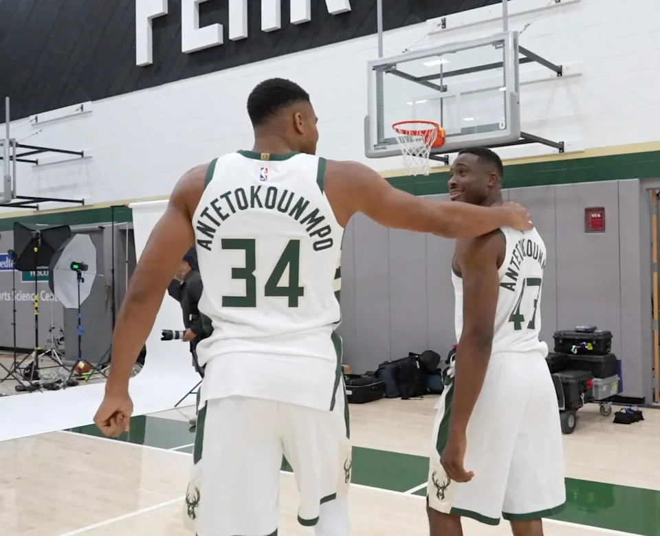 Brothers Milwaukee Bucks forward Giannis Antetokounmpo (34) and forward Thanasis Antetokounmpo walk to take a photo during the Milwaukee Bucks media day at the Sports Science Center in Milwaukee on Monday, Oct. 2, 2023. They were teammates from 2019-24.