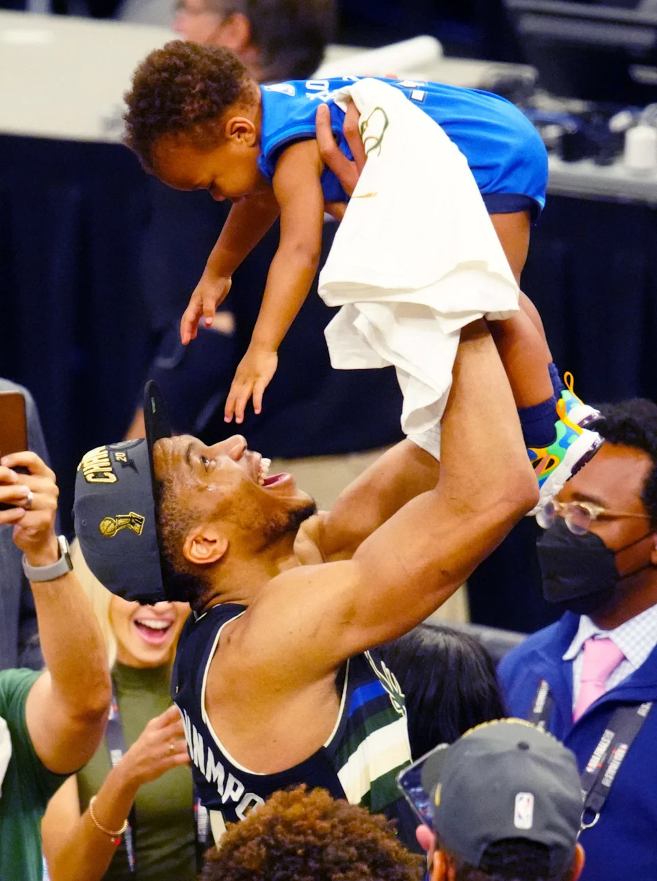 Giannis Antetokounmpo celebrates with his young son Liam after the Milwaukee Bucks won the NBA championship on July 21, 2021, at Fiserv Forum in Milwaukee, Wisconsin.