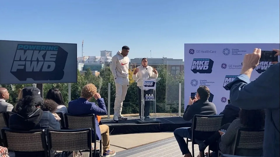 Milwaukee Bucks player Giannis Antetokounmpo, left, and wife Mariah announce a $1 million initiative to support Milwaukee nonprofits working on such issues as housing, food access and education. The initiative is funded by the Charles Antetokounmpo Family Foundation, GE HealthCare and GE HealthCare Foundation.