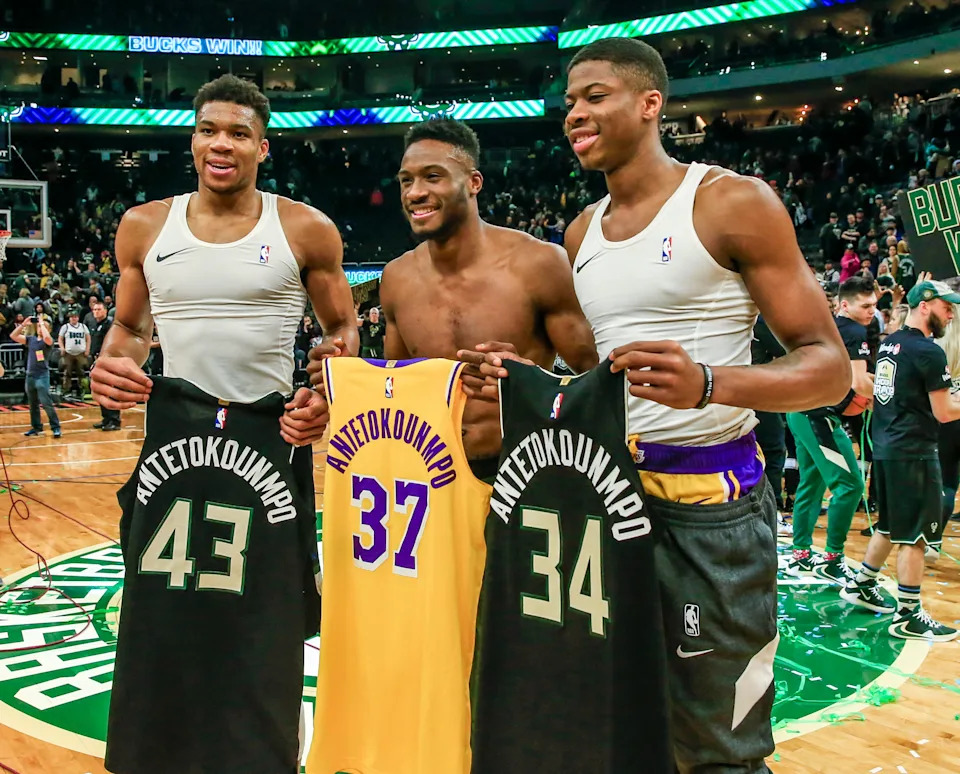Milwaukee Bucks forward Giannis Antetokounmpo, Los Angeles Lakers forward Kostas Antetokounmpo and Milwaukee Bucks forward Thanasis Antetokounmpo posetogether after their game on Dec. 19, 2019, at Fiserv Forum in Milwaukee.