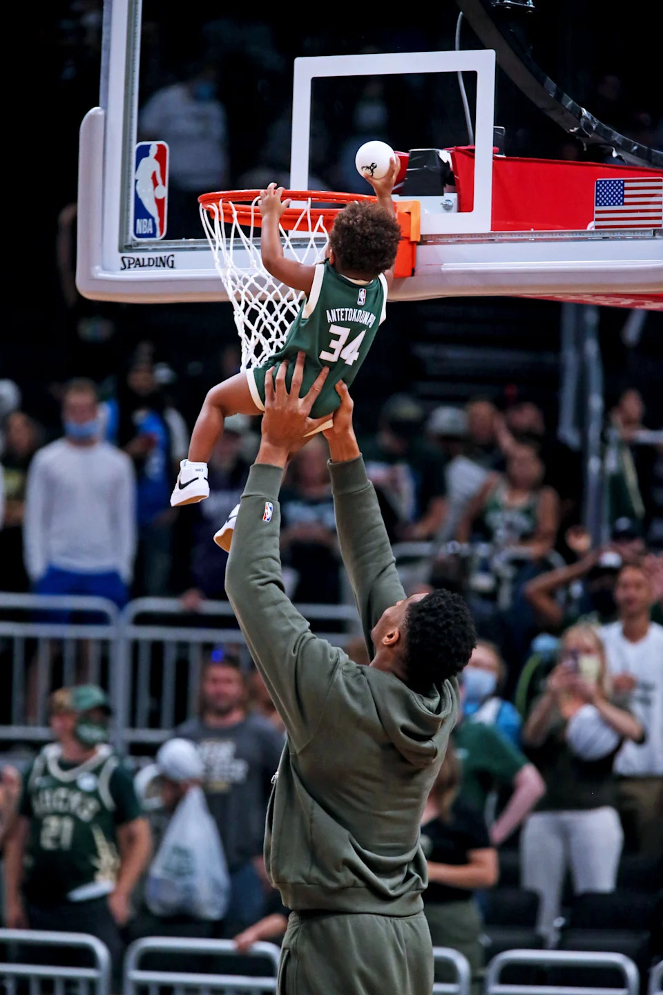 Giannis Antetokounmpo lets his son Liam in on the game action following a scrimmage on Sunday, Oct. 3, 2021, at Fiserv Forum.
