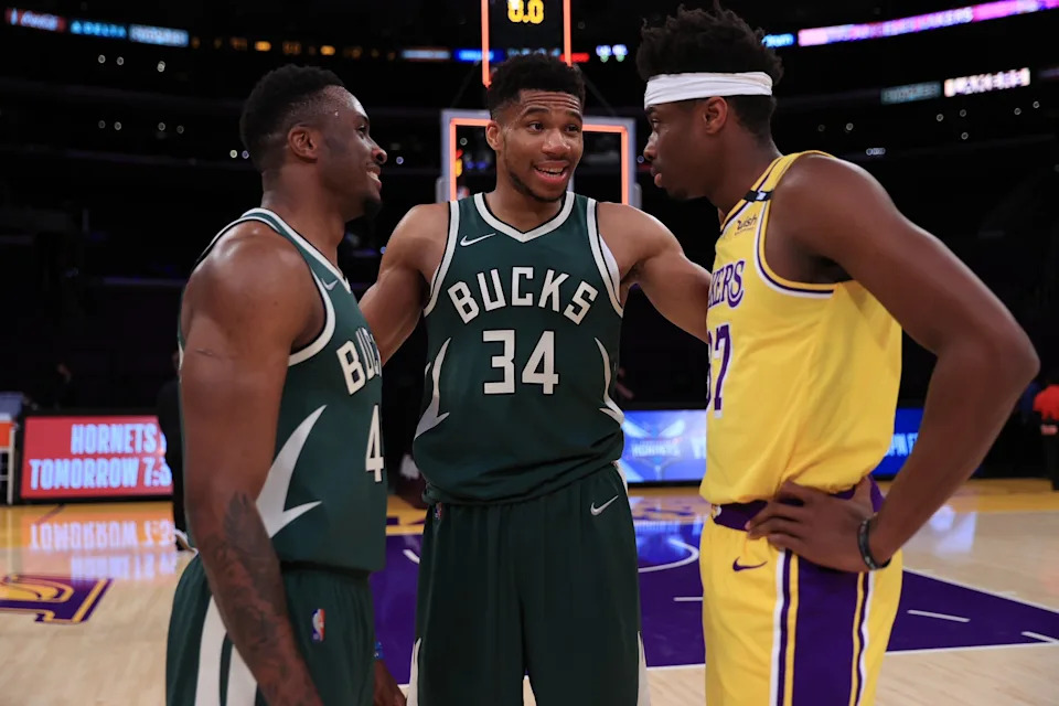 Thanasis Antetokounmpo, Giannis Antetokounmpo and Kostas Antetokounmpo (from left to right) talk after the Milwaukee Bucks beat the Los Angeles Lakers on March 31, 2021 at STAPLES Center. It was the first time the three brothers played together in the NBA and second time ever a trio of brothers played in an NBA game.