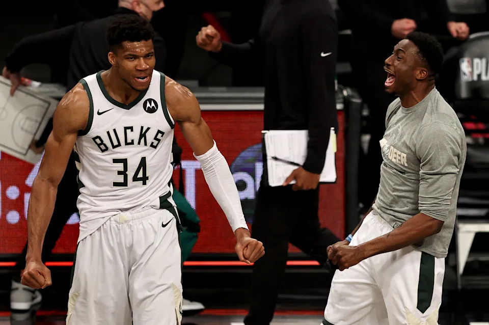 Giannis Antetokounmpo and Thanasis Antetokounmpo of the Milwaukee Bucks celebrate the win of Game 7 of the Eastern Conference second round at Barclays Center on June 19, 2021, in the Brooklyn borough of New York City. The Milwaukee Bucks defeated the Brooklyn Nets 115-111 in overtime to win the series.