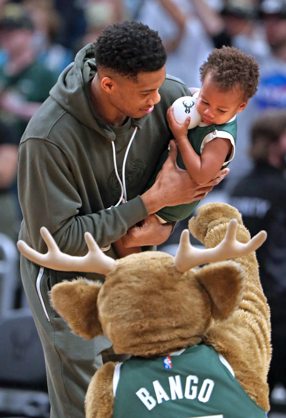 Milwaukee Bucks MVP Giannis Antetokounmpo holds his son, Liam, who isn’t quite sure what to make of the team’s mascot Bango at the inter-squad scrimmage on Sunday, Oct. 3, 2021, at Fiserv Forum.