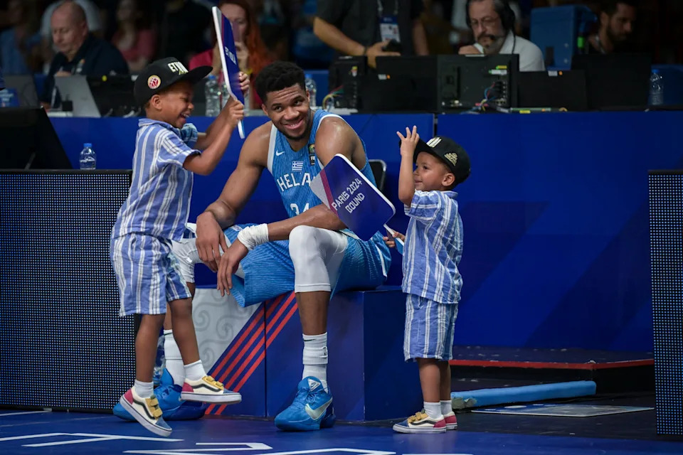 Greece’s Giannis Antetokoumpo reacts with his sons Liam and Maverick as he celebrates Team Greece beating Croatia in the FIBA Olympic Qualifying Tournament to qualify for the Paris 2024 Olympics on July 7, 2024.