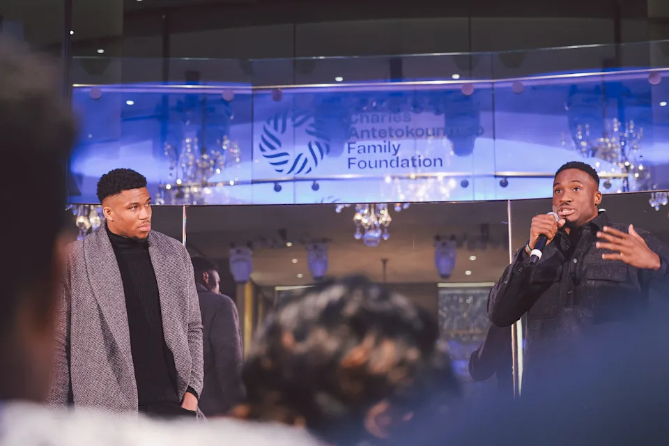 Giannis and Thanasis Antetokounmpo address 200 people at their fundraising gala in New York for the Charles Antetokounmpo Family Foundation (CAFF). The foundation is named in honor of the Antetokounmpos’ late father.